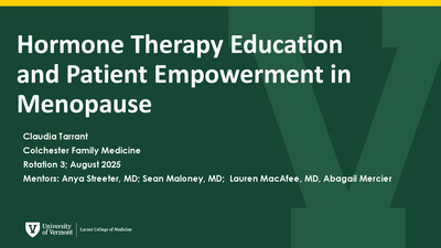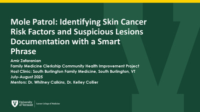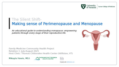 Short-term ProjectHypertension continues to be a prevalent condition in Washington County and throughout the state of Vermont, contributing to significant cardiovascular risk. Many individuals remain unaware of their blood pressure status, are less motivated to address moderately elevated readings, or do not engage in regular monitoring. These factors all give rise to suboptimal management. To address these challenges, this project implemented two interventions focused on the Washington County community and the CVMC Family Medicine – Waterbury clinic. A patient-facing blood pressure guide was developed and integrated into Epic for provider use, and a community education booth was held outside a local pharmacy. These initiatives aimed to increase awareness, empower patients to take an active role in blood pressure management, and provide practical, accessible guidance for those that were willing to make health-promoting changes.