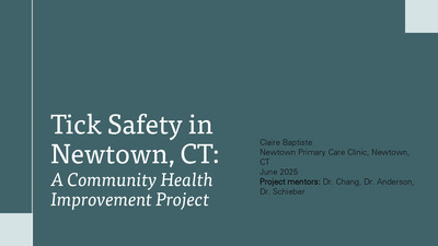 Short-term ProjectConnecticut is a high-risk area for tick bites. Blacklegged tick (Ixodes scapularis) is the primary vector of Borrelia burgdorferi, the bacteria responsible for Lyme disease o Fairfield County reports the second-highest number of Lyme disease cases in the state. Ticks are active from early spring to late fall, overlapping with high outdoor activity seasons o June is peak nymphal stage of blacklegged ticks. Despite public education efforts, many patients remain unaware of when to seek medical care after a tick bite, as well as best practices for tick prevention and removal. There is a clear need for enhanced local education to improve early intervention and reduce the risk of complications.