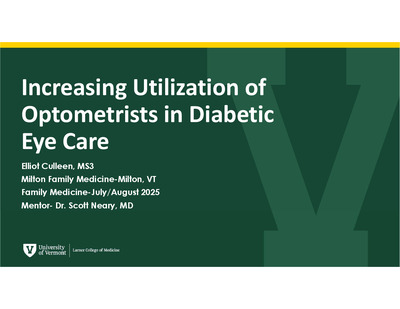 Short-term ProjectDiabetes is a metabolic condition that continues to be increasing in prevalence. Of the various end-organ effects that diabetes has, diabetic retinopathy is an area that needs more attention in the primary care setting. Diabetes is the leading cause of new onset blindness in patients 25-64. Additionally, of patients with known diabetes, only 60% receive regular screening care to assess for diabetic retinopathy. The reasons for this are not well elucidated, but with interviewing eyecare providers in the surrounding region of Milton, VT the consensus was there is a lack of providers and a lack of patient education. This project seeks to increase patient awareness of local eye care providers through an up-to-date list of providers accepting new patients, and the creation of a poster to be hung in patient rooms informing them of the need for yearly diabetic eye exams.