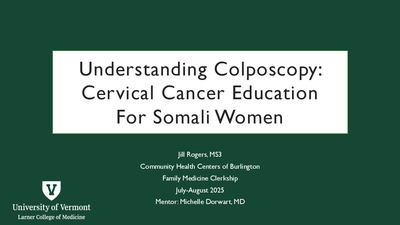 Short-term ProjectThe HPV vaccination series is a safe and efficacious public health tool for prevention of cervical, anal, vulvar, vaginal, penile, and oropharyngeal cancers, yet rates of HPV vaccination in rural Vermont lag behind those of the greater state. This community health improvement project involves distribution of an HPV vaccine informational handout to male and female patients between the ages of 18 and 26 years. The primary objective of this work being to increase awareness of the safety, efficacy and availability of the HPV vaccination series for individuals over the age of 18. This project seeks to empower patients to engage in conversations with providers regarding their healthcare preferences with the ultimate goal of enhancing patient-centered decision making and promoting better health outcomes.
