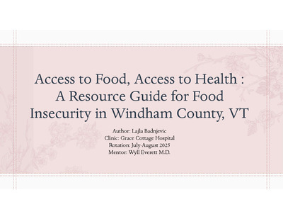 Short-term ProjectFood insecurity in Windham County has increased from 12.3% in 2019 to 13.6% in 2023. Research shows a strong link between food insecurity and increased risk of cardiovascular conditions, including hypertension, heart disease, and stroke. Individuals already living with these conditions are also more likely to experience food insecurity, often at more severe levels. In Vermont, poor diet is one of three key behaviors contributing to four major diseases—cancer, heart disease and stroke, type 2 diabetes, and lung disease—which together account for over 50% of deaths statewide. These chronic illnesses also place a significant financial strain on the healthcare system, with national costs projected to reach trillions in the coming decades. In response, I developed a comprehensive pamphlet that brings together information on food insecurity, local food assistance programs, and how individuals can access support. The pamphlet is distributed by clinical staff to patients who screen positive for food insecurity, offering clear, actionable information. It serves as a convenient, offline resource that brings key information together in one place, complete with phone numbers and guidance for getting started. The goal is to empower patients to engage with available resources and support informed, patient-centered conversations within the clinical setting. Results of the project have yet to be studied.