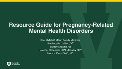 Short-term ProjectPregnancy-related mental health disorders, such as postpartum depression (PPD), postpartum psychosis (PPP), and perinatal or postpartum mood and anxiety disorder (PMAD), affect a significant portion of new mothers in the United States. Rural areas such as Milton, Vermont, face unique challenges, including a shortage of mental health providers and limited access to specialized postpartum care. This resource guide will aid in early identification and intervention that is crucial to preventing severe outcomes for both mothers and their infants.